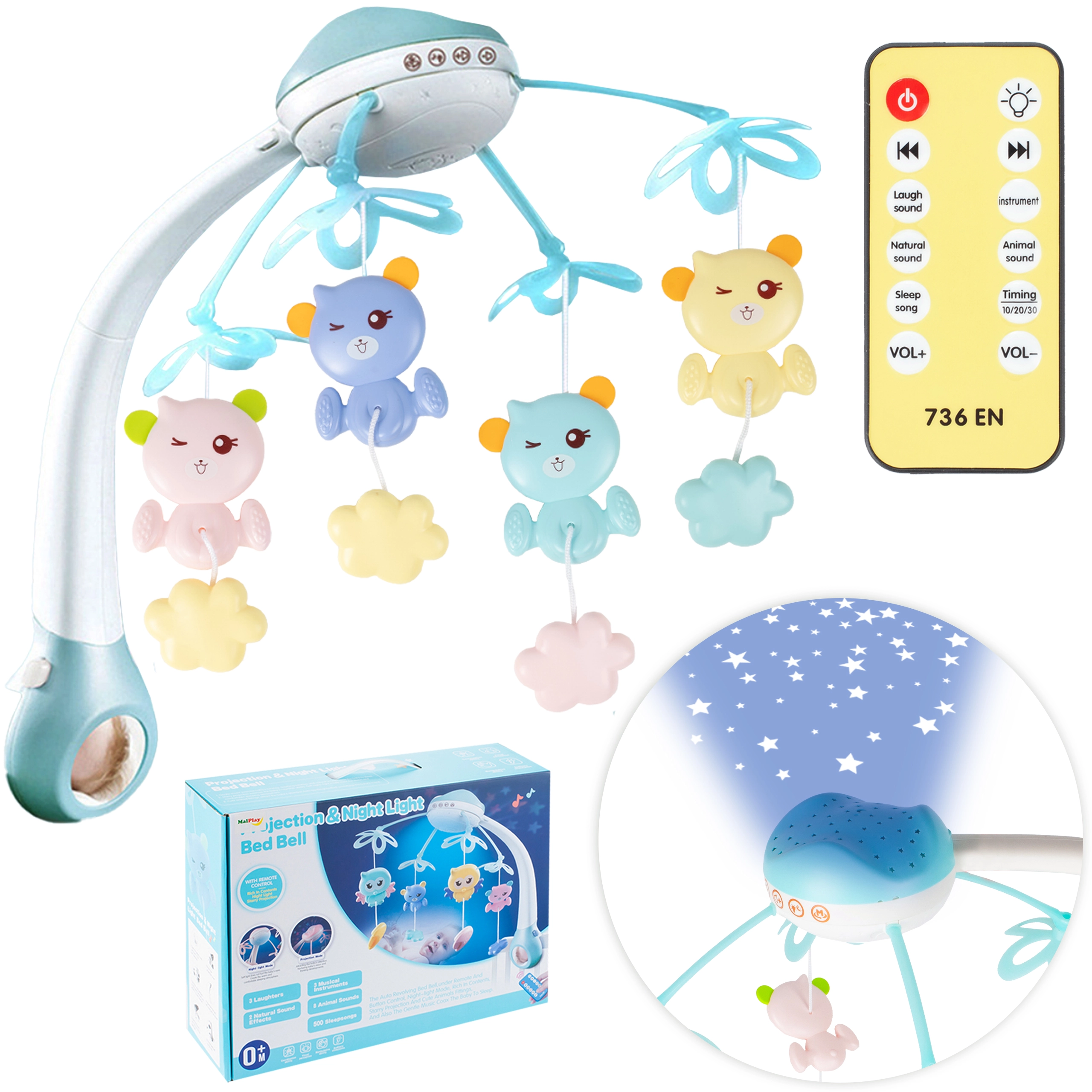 Muzikinė karuselė su žvaigždžių projektoriumi ir nuotolinio valdymo pultu lovytei – Mėlyna
