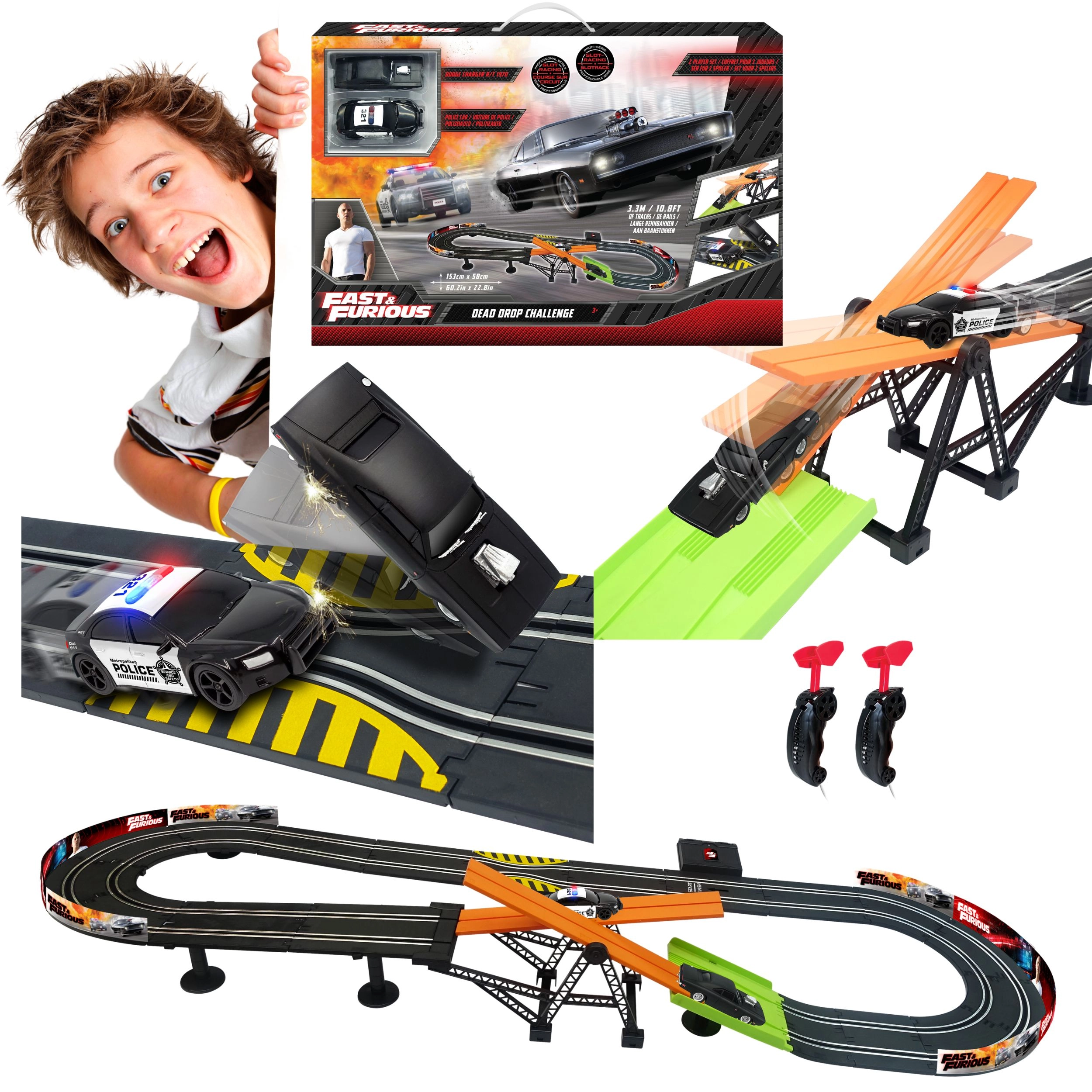 Išsirinkite lenktynių rinkinį tiksliai pagal poreikius: mastelis 1:64, 1:43 arba 1:32, trasos ilgis – nuo kompaktiškų žiedų iki didelių lenktynių trasų, užimančių visą kambarį. Nuotoliniai valdikliai su tolygiu reguliavimu leidžia tiksliai dozuoti galią, elektroninis ratų skaitiklis ir laiko matavimas suteikia varžybinės įtampos, o skaitmeninis autodromas leidžia lenkti ir keisti eismo juostą. Modulinės dalys, perjungimai, tiltai, tuneliai ir atitvarai užtikrina universalumą ir begalines konstravimo galimybes.