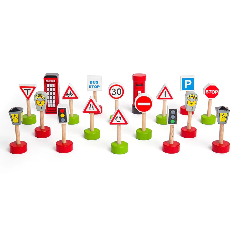 Čia rasite rinkinius ir atskirus elementus įvairių tipų: medinius ir plastikinius kelio ženklus vaikams, stabilias pakojas, aiškius simbolius ir kruopštų apdirbimą. Elementai yra patvarūs, aiškūs ir lengvai derinami su mašinėlėmis, autodromu, mediniu geležinkeliu ir konstruktoriais, tad paprastai sukursite sankryžas, automobilių stovėjimo aikšteles ar statybvietes. Eismo ženklinimas mašinėlėms taip išplės žaidimų pasaulį ir paskatins kūrybišką trasų statybą.