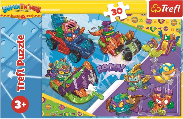 Vaikiška dėlionė su motyvu SuperThings: super šnipų komanda suteikia pramogą ir lavina įgūdžius patiems mažiausiems. Sudaryta iš 30 dalių, rekomenduojama nuo 3 metų, sudėjus dydis apie 27 × 20 cm – idealiai tinka pirmai dėlionei, smulkiajai motorikai ir susikaupimui lavinti.