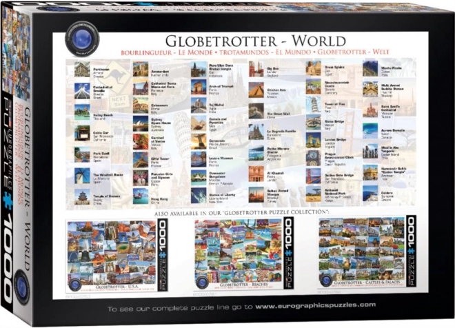 Atraskite pasaulį neišeidami iš namų su šia 1000 dalių EUROGRAPHICS dėlione iš Globetrotter kolekcijos. Iliustracijoje pavaizduota daugiau nei 40 ikoniškų pasaulio vietų ir ji siūlo didesnį sudėtingumą dėl unikalių detalių formų. Idealiai tinka patyrusiems dėliotojams, ieškantiems aukštos kokybės ir smagios užduoties.