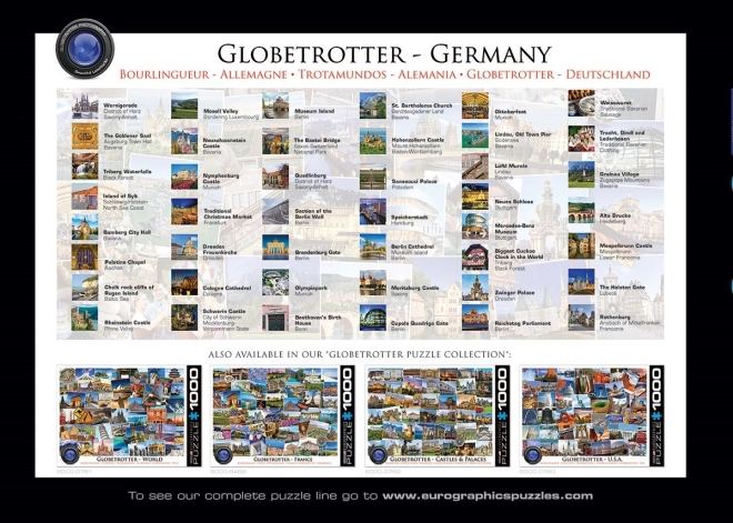 Atraškite Vokietijos grožį su aukštos kokybės EUROGRAPHICS dėlione, sudaryta iš 1000 dalių. Dėl unikalios, netaisyklingų formų štampuotės dėliojimas yra ir iššūkis, ir pramoga. Surinktos dėlionės dydis apie 68 × 48 cm. Originalios detalių formos, aukštesnis sudėtingumas ir išsami Vokietijos žemėlapio grafika pradžiugins kiekvieną dėlionių ir kelionių entuziastą.