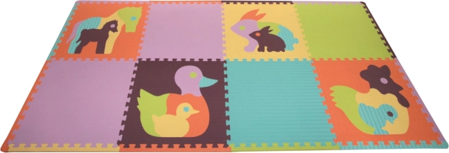 Didelis žaidimų kilimėlis su spalvingų gyvūnėlių motyvais. Putų dėlionė moderniomis spalvomis ir su įvairiomis paviršiaus tekstūromis suteikia saugią, minkštą žaidimų aplinką, skatina vaikų motorikos ir vaizduotės raidą.