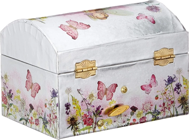 Ši papuošalų dėžutė, įkvėpta muzikinių skrynių stiliaus, derina žavų dizainą ir funkcionalumą. Sidabrinį blizgesį papildo subtilūs gėlių ir drugelių motyvai, viduje yra ovalus veidrodėlis ir besisukanti balerina. Atidarius dangtelį, suskamba žymi Gulbių ežero melodija, lydinti kiekvieną žiedo ar auskarų padėjimą į saugią vietą.