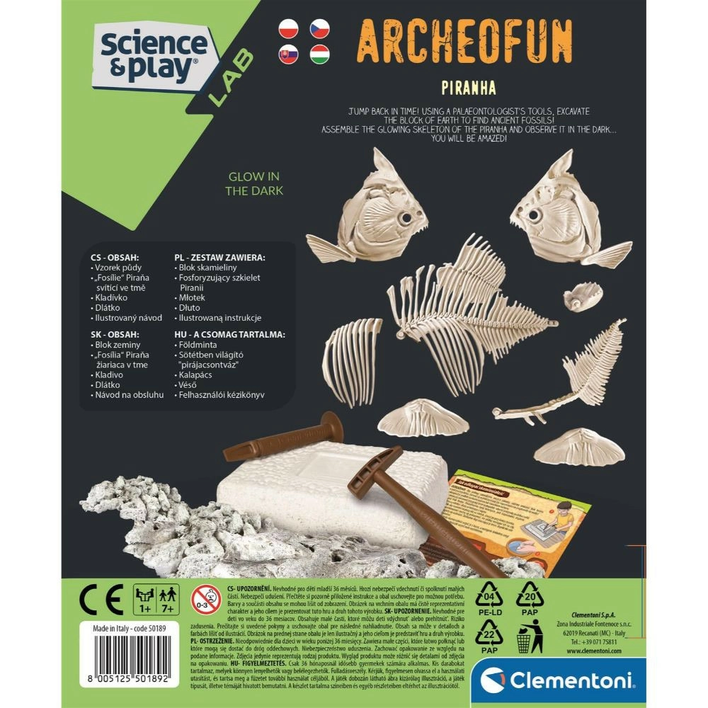 Tapkite mažuoju paleontologu ir atraskite plėšrios žuvies – piranijos – griaučius! Šis smagus archeologinis rinkinys iš Clementoni leis vaikams, naudodami pridėtus įrankius, atsargiai „iškasti“ fosiliją ir surinkti šviečiančią piranijos griaučių kopiją. Pagal iliustruotą instrukciją sužinosite daugiau apie fosilijas, jų susidarymą ir apie tai, kur šiandien gyvena piranijos. Puikus pasirinkimas lavinti vikrumą, kūrybiškumą ir domėjimąsi mokslu.