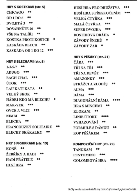 Penkiuose dvišaliuose lentose rasite, be kita ko, Arkliai, Dama, Žąsų žaidimas, Kopėčios ir gyvatės, Blusų lenktynių trasa, Avys ir vilkai, Linija, Adugo, Lenktynių trasa, Blusų kaskada, Bagh Chal, Lau Kati Kata, taip pat loginius galvosūkius Pentamimo ir Tangram. Dėl skirtingų sudėtingumo lygių puikiai tinka ir vaikams, ir suaugusiesiems.