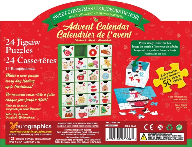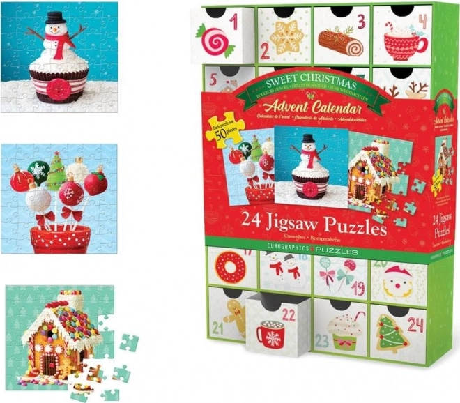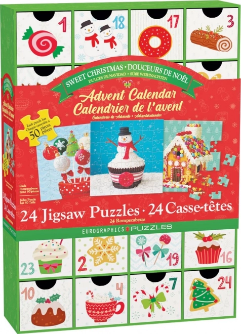 EUROGRAPHICS advento kalendorius „Saldžios Kalėdos“ paverčia gruodį smagia tradicija. Kiekviename iš 24 stalčiukų slepiasi kvadratinė 50 dalių dėlionė su gardžiais saldumynų motyvais. Paveikslėliai yra 12,5 × 12,5 cm dydžio, o pavyzdys patogiai atspausdintas ant kiekvieno stalčiuko nugarėlės, kad būtų lengviau dėlioti.