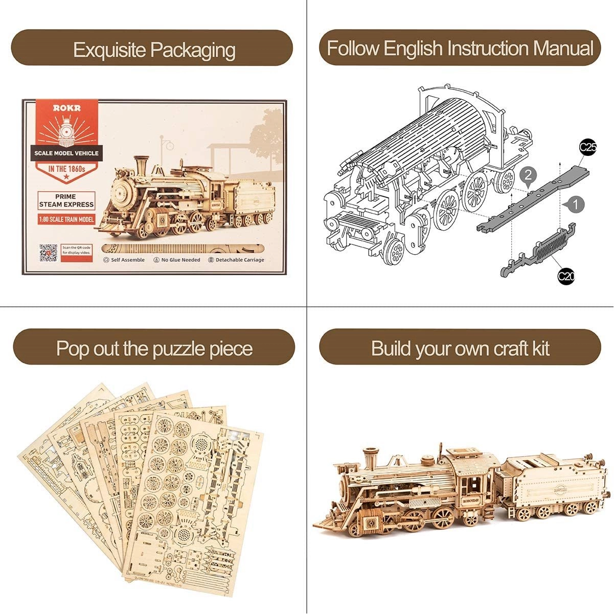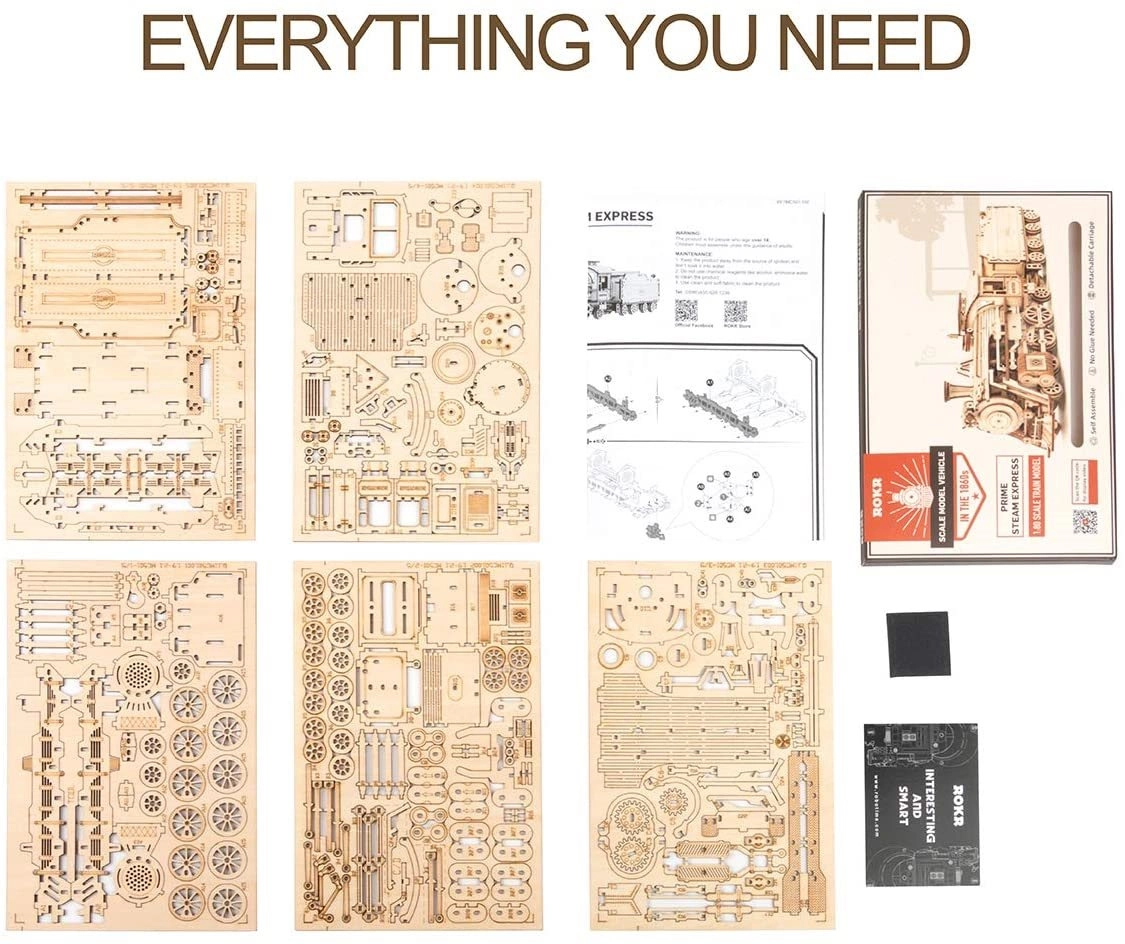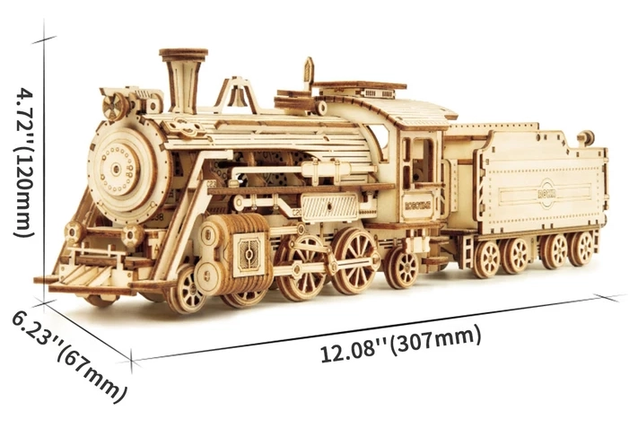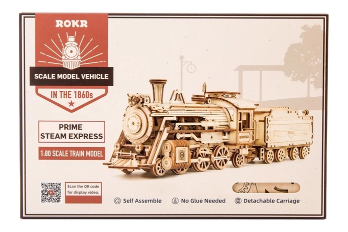 Mėgaukitės pramoga ir kūrybiškumu su 3D mediniu modeliu Prime Steam Express. Šis istorinis traukinys datuojamas 1860 m. ir priklauso serijai ROBOTIME ROKR Model Vehicles Series. Visos detalės kruopščiai išpjautos lazeriu iš 2 mm storio liepos faneros. Surinkimui nereikia klijų, o modelyje yra realistiškų detalių, tokių kaip garo švilpukas, veleno krumpliaračiai ir atskiriamas tenderis.