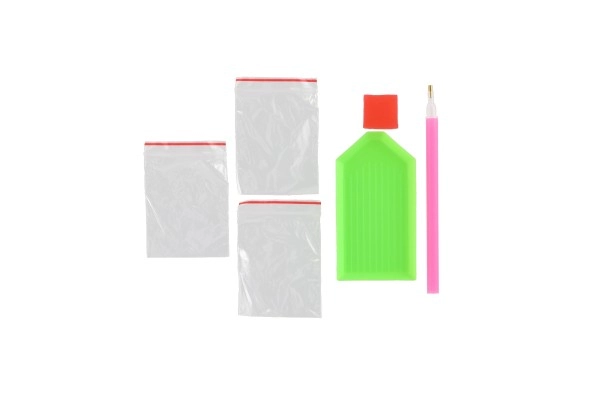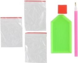 - iš anksto atspausdinta drobė, spalvotų akmenėlių rinkinys, aplikavimo rašiklis, lėkštelė, vaškas