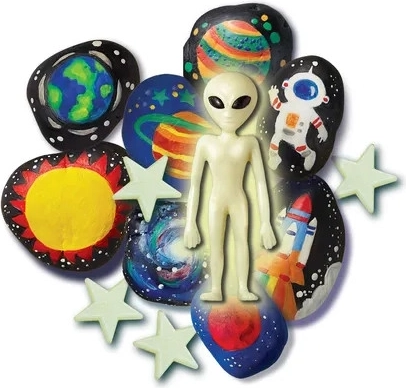 Atraskite kūrybiško tapymo pasaulį su šiuo akmenų tapybos rinkiniu, kuris pristato kosminius motyvus. Su fosforescuojančiais elementais šis rinkinys lavina vaikų vaizduotę ir kūrybiškumą.