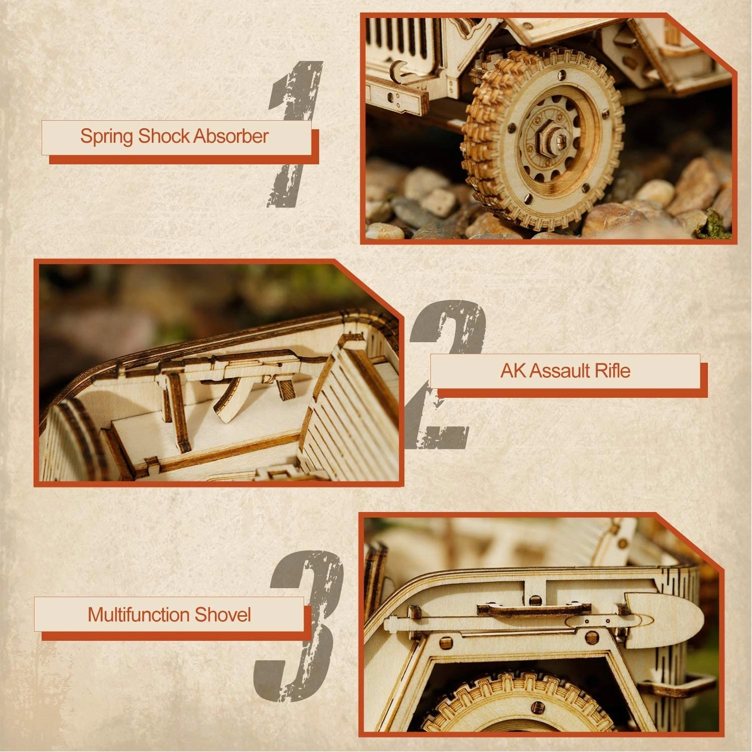 Modelyje yra tikroviškų elementų, tokių kaip tvirti ratai, spyruoklės, automatinis šautuvas ir kitos detalės, suteikiančios autentiškumo.