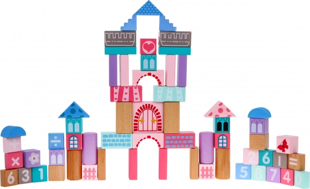 Rinkinyje yra spalvotų kaladėlių, iš kurių galima sukurti pasakišką pilį, skatinančią vaikų kūrybiškumą.