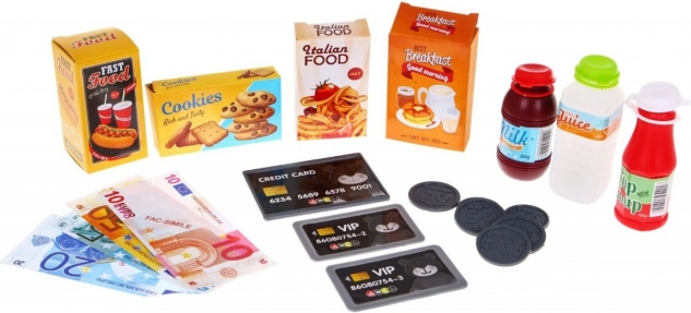 Rinkinyje taip pat yra maisto imitacijos, tokios kaip kečupas, sultys, pienas ir įvairios kartoninės dėžutės, kurios praturtina žaidimą ir skatina vaikų vaizduotę.