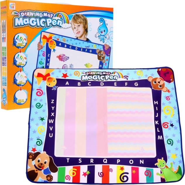 Šis vandens piešimo kilimėlis pagamintas iš malonios medžiagos ir lengvai sulankstomas. Skirtingai nei popierius, jis yra daugkartinio naudojimo. Pieškite magišku flomasteriu, o po 10 minučių vėl galėsite kurti. Kilimėlį papildo įvairių elementų šablonai, kuriuos vaikas gali apvedžioti, taip skatindamas jo raidą.