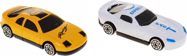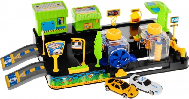 Pakuotėje rasite 2 mašinėles, rampas, užtvarus, ženklus ir dekoracijas, įskaitant degalinę ir parduotuvę/restoraną.
