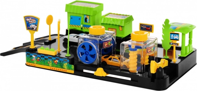 Viduje yra viskas, ko reikia mažiesiems vairuotojams: 2 skirtingų spalvų mašinėlės, didelis pagrindas, kelio ženklinimas, rampas, judanti užtvara ir gausios dekoracijos (medeliai, gėlinės, parduotuvė/restoranas, degalinė). Dėl ryškių spalvų ir kruopštaus apdailos rinkinys patiks net ir reikliems mažiesiems konstruktoriams.