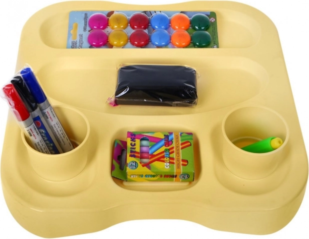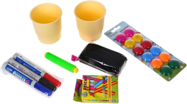 Rinkinyje yra plastikiniai puodeliai, flomasterių rinkinys, kreidos, magnetai ir kreidų laikiklis – viskam, ko reikia įvairiai meninei veiklai.