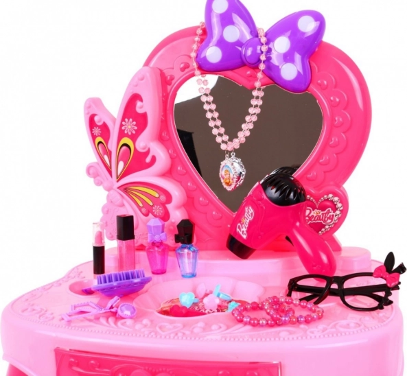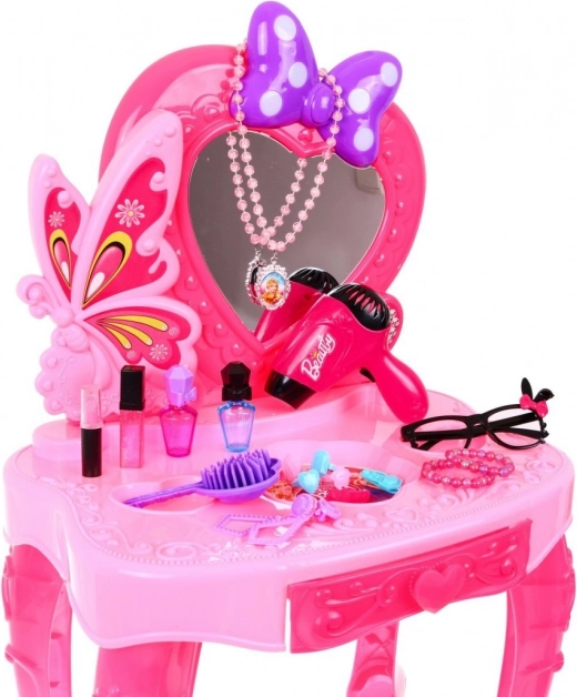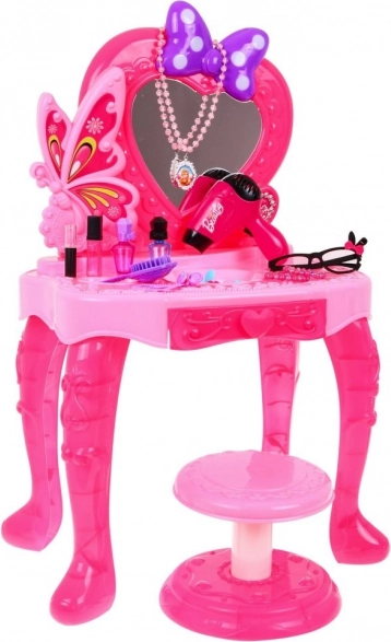 Mielas rožinis tualetinis staliukas mažosioms puošeivoms siūlo šviesos ir garso efektus, interaktyvų feną su pūtimu ir gausų priedų rinkinį kūrybiškam žaidimui. Yra atidaromas stalčiukas lobiams, stabilus stalelis su veidrodžiu ir patogi kėdutė. Idealu vaikams nuo 3 metų, pabrėžiant vaizduotę, vaidmenų žaidimą ir smulkiąją motoriką.