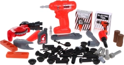 Rinkinio turinys (pasirinktinai iš 78 vnt.): lagaminėlis, stovas, gręžtuvas/atsuktuvas su keičiamomis galvutėmis, pjūklelis, plaktukas, kryžminis atsuktuvas, vamzdinis ir reguliuojamas raktai, medinės detalės, varžtai, veržlės, lipdukai ir kiti priedai.