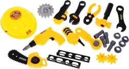 - 23 dalių rinkinys su realistiškais priedais – šalmas, gręžtuvas, plaktukas, pjūklelis, raktai, replės ir kt.