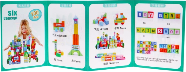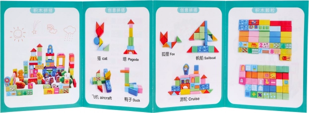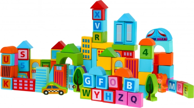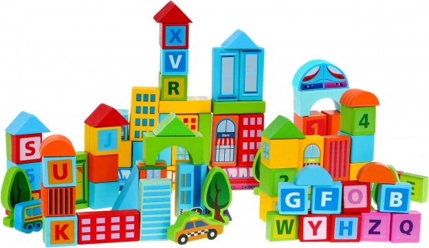 Medinės kaladėlės yra vieni mėgstamiausių žaislų per kelias kartas. Šis gausus rinkinys apima 100 kruopščiai pagamintų detalių įvairių spalvų ir formų, kurių dėka vaikai lengvai pastatys miestą, tiltus ar bokštus. Dauguma detalių puošti gyvūnėlių, raidžių ir figūrų motyvais, kurie natūraliai skatina pažinimą ir mokymąsi žaidžiant.