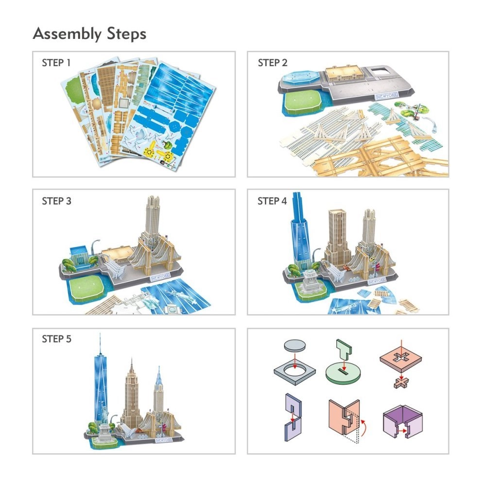 Rinkinyje rasite garsiausias NIUJORKO dominantes, pavyzdžiui, Laisvės statulą, Empire State Building, One World Trade Center bei žymiuosius miesto tiltus. Orientacinis konstravimo laikas – 150–180 minučių, todėl tai puikus šeimos projektas ir dovana architektūros bei dizaino mėgėjams.
