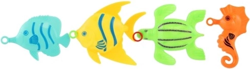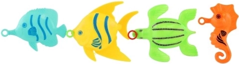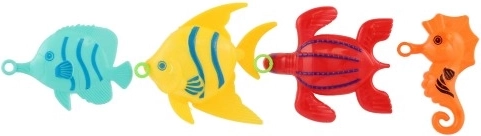Rinkinyje yra 4 ryškiaspalvės žuvytės, kurios skatina vaikų vaizduotę ir motyvuoja žaisti bei varžytis – kas jas sugavus greičiausiai?