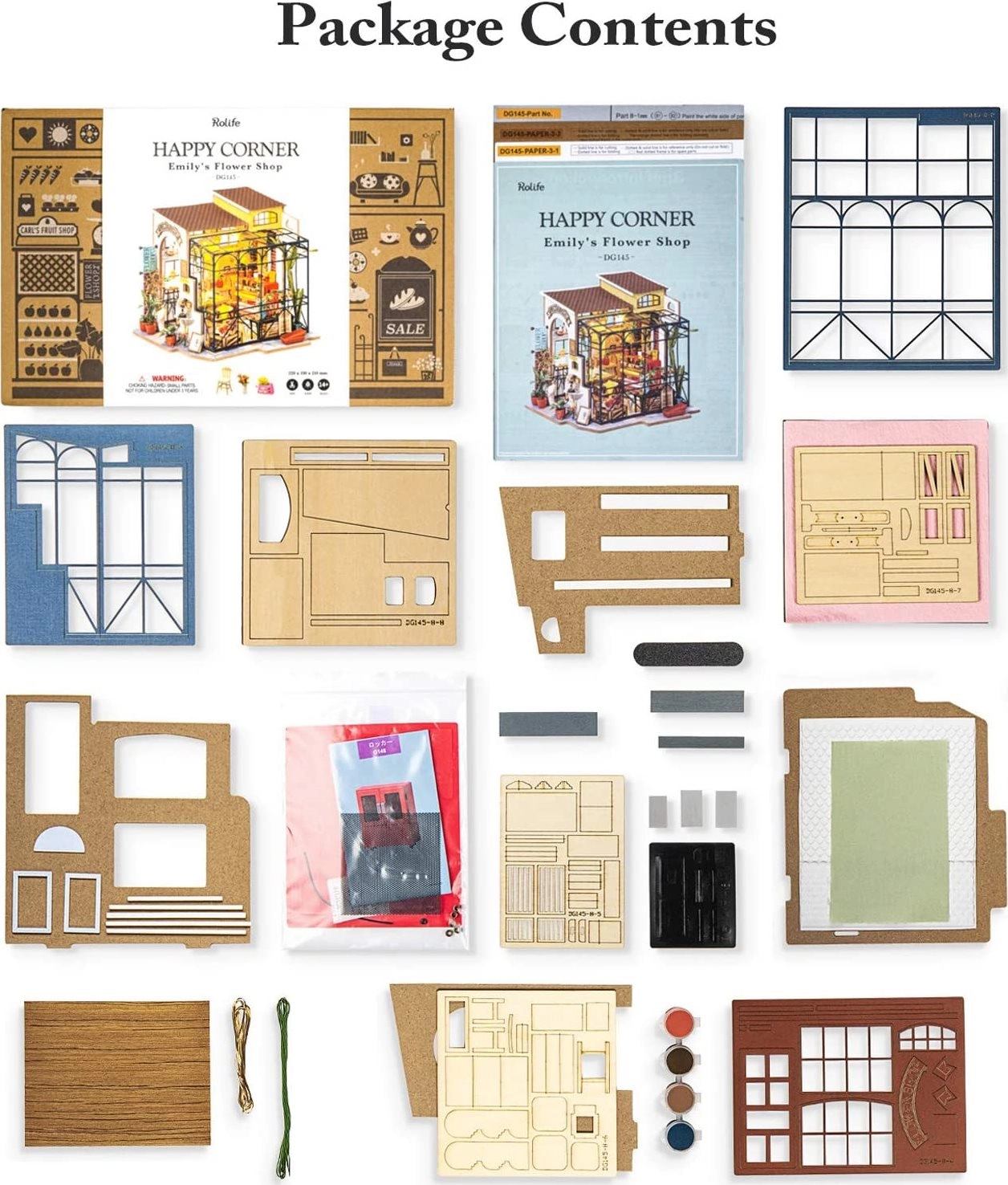 Į pakuotę įeina iš anksto išpjautos detalės, klijai, dažai, teptukas ir LED lemputės su baterijomis. Užtenka turėti žirkles ir galima kibti į kūrybą.