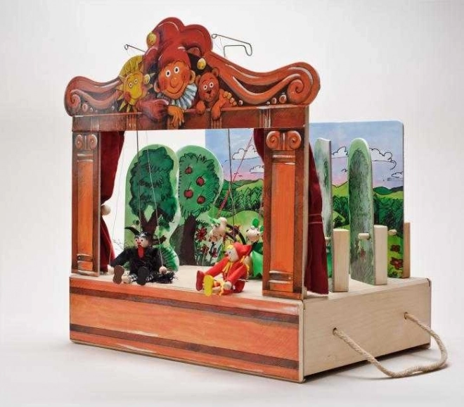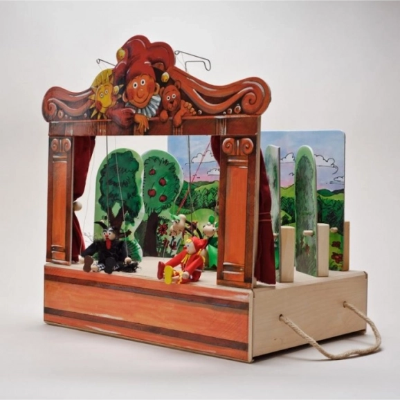 Medinis teatras su 2 dvišalėmis dekoracijomis ir 8 lėlėmis. Rankų darbo lėlės su galimybe papildyti naujomis lėlėmis ir dekoracijomis.
