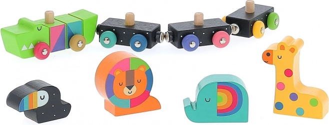Leiskitės su vaikais į kūrybinę kelionę su spalvingu gyvūnėlių traukinuku pagal pripažinto iliustratoriaus Andy Westface dizainą. Šis unikalus medinis rinkinys apima kaladėles, kurios skiriasi dydžiu, forma ir ryškiomis spalvomis. Garvežys ir vagonėliai, vaizduojantys krokodilą, liūtą, dramblį ir žirafą, sumaniai sujungti magnetais. Vaikai mėgausis ne tik dėliojimu, bet ir gyvūnėlių pažinimu.
