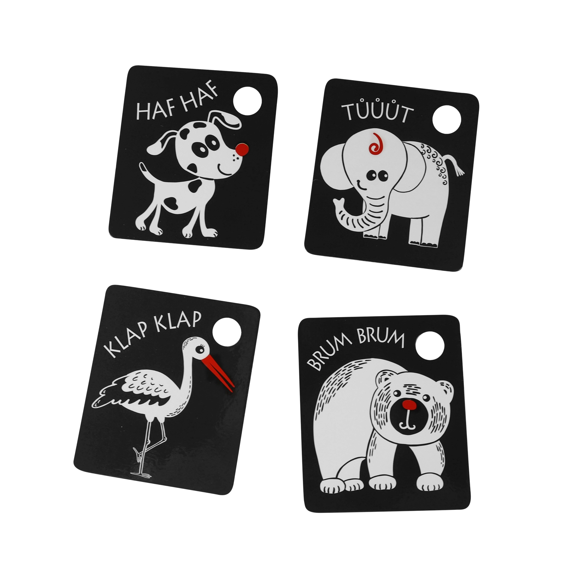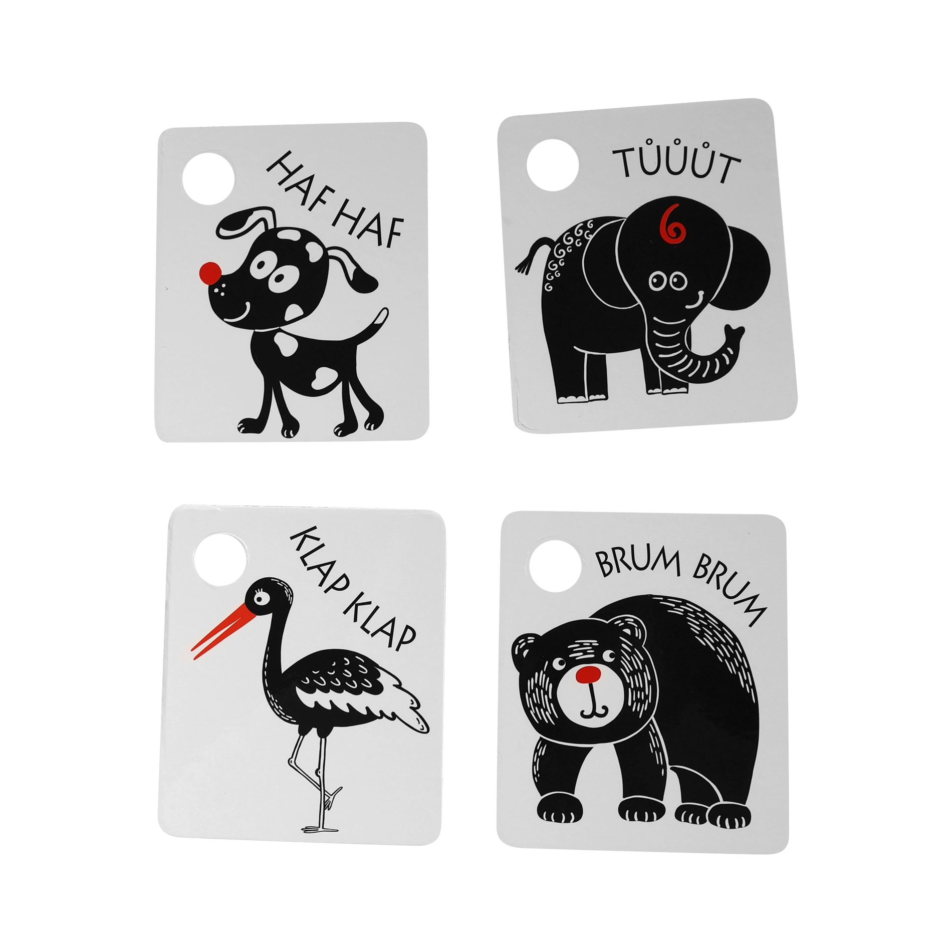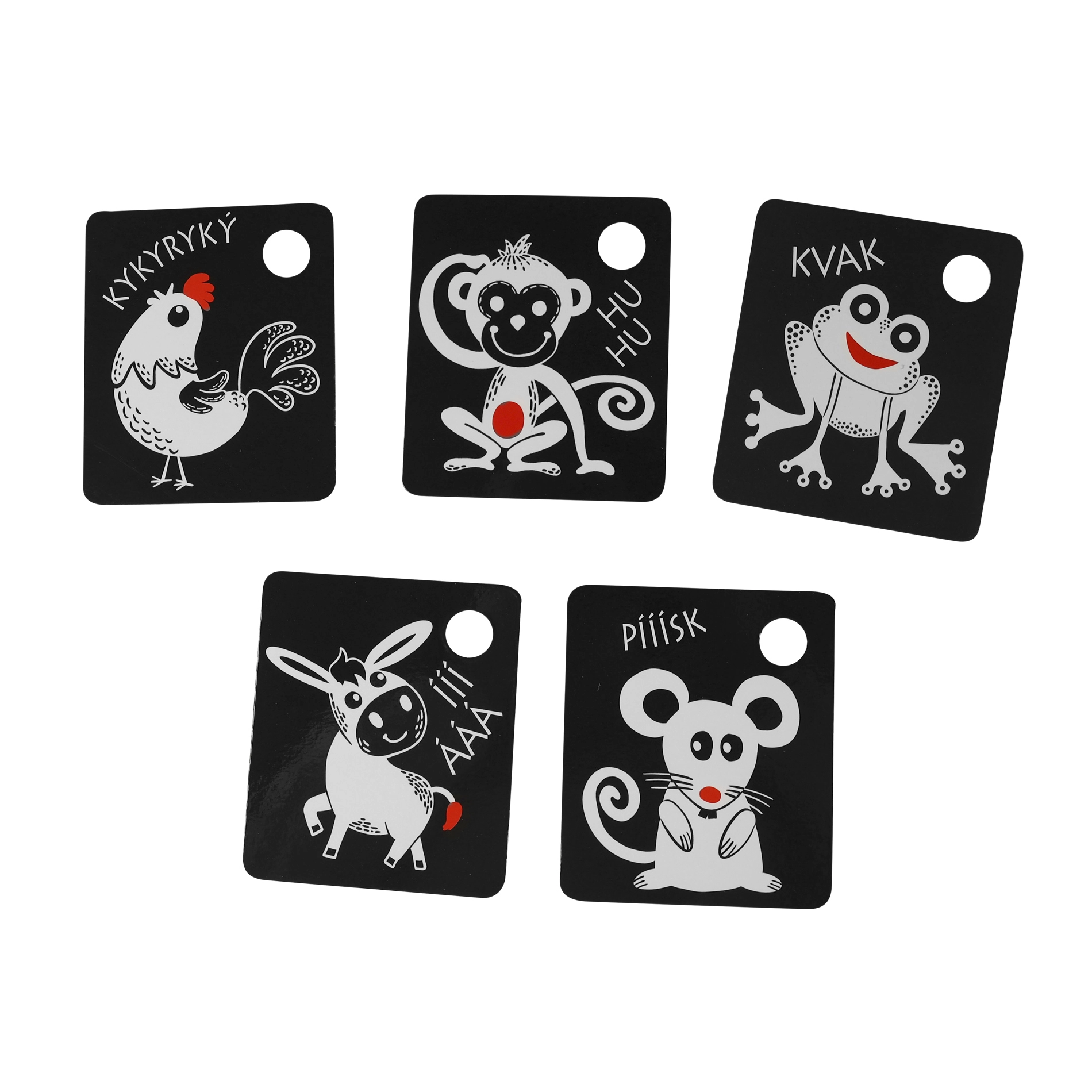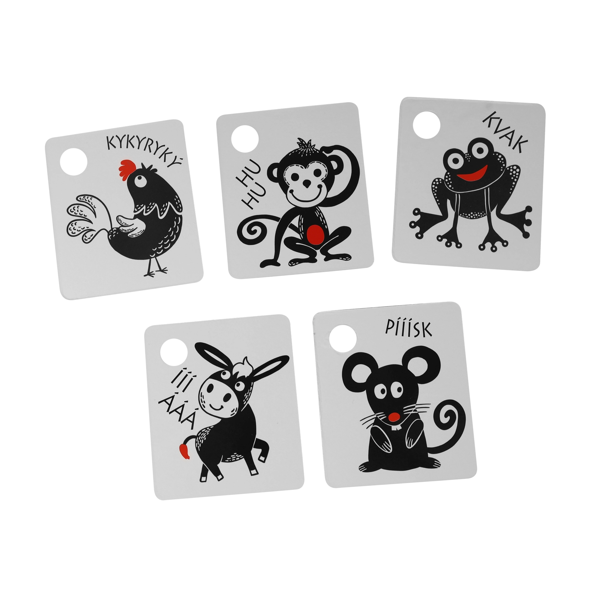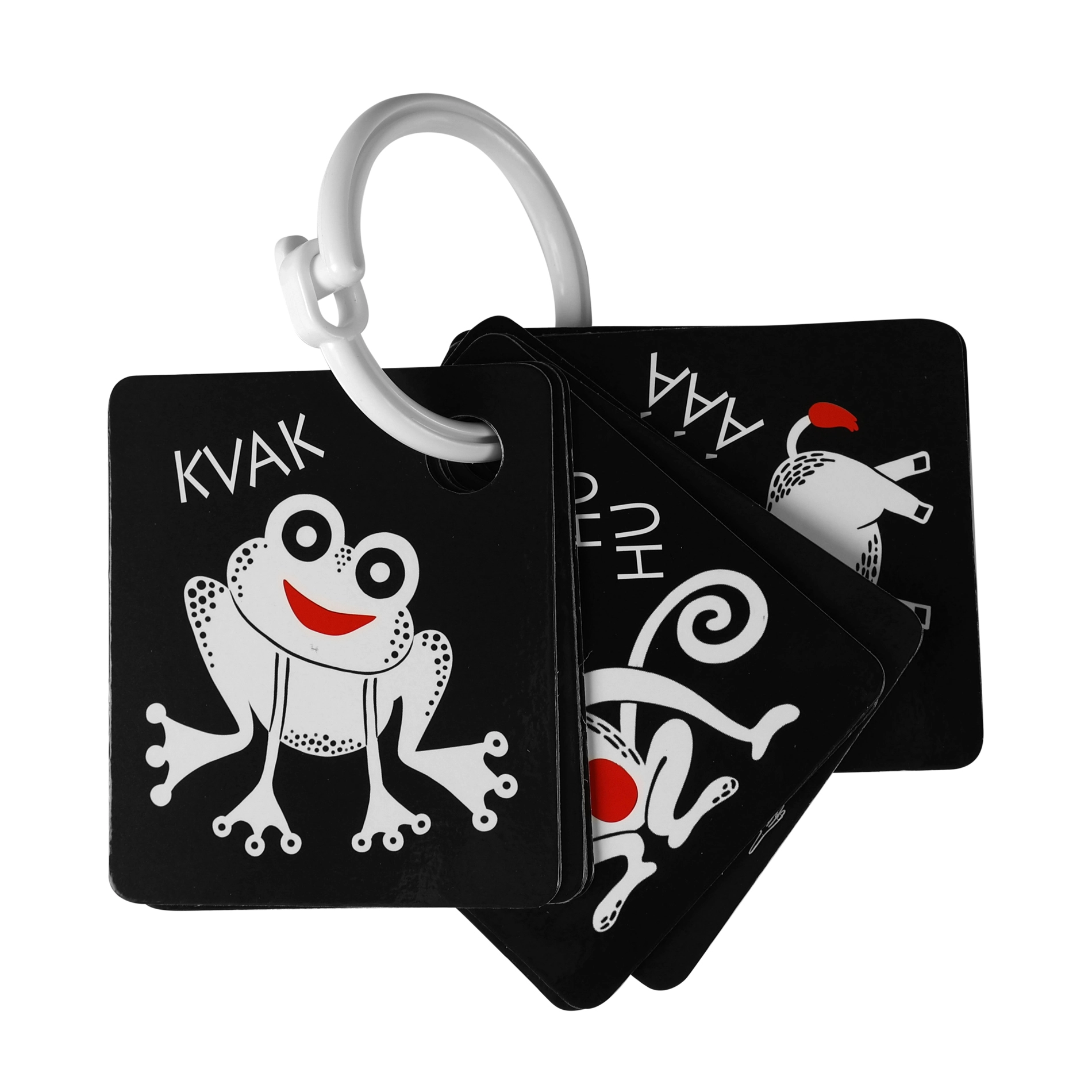 Kiekviena kortelė turi praktišką angą pakabinimui ant lovytės, vežimėlio ar žaidimų arkos, o rinkinyje esantis patvarus plastikinis žiedas leidžia lengvai sujungti visą komplektą. Kokybiškos čekų medžiagos užtikrina ilgaamžiškumą ir saugų naudojimą.