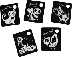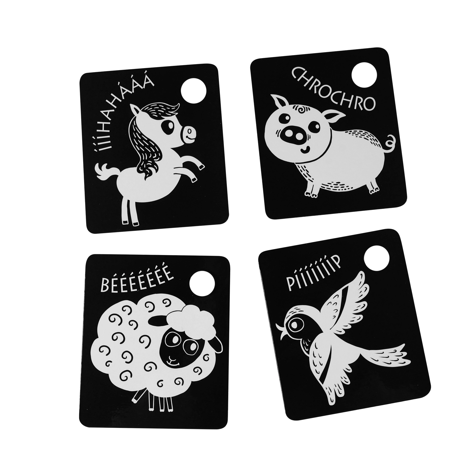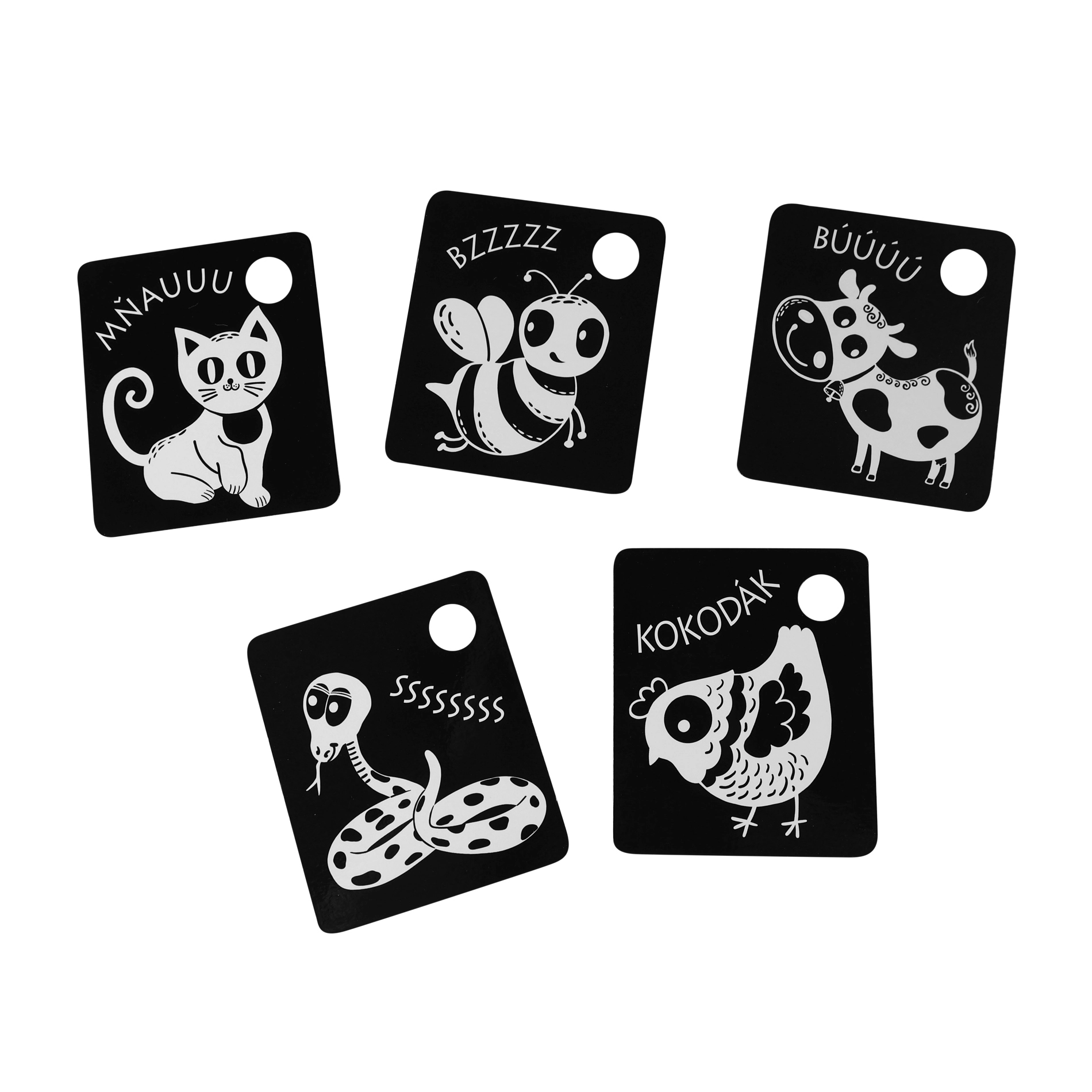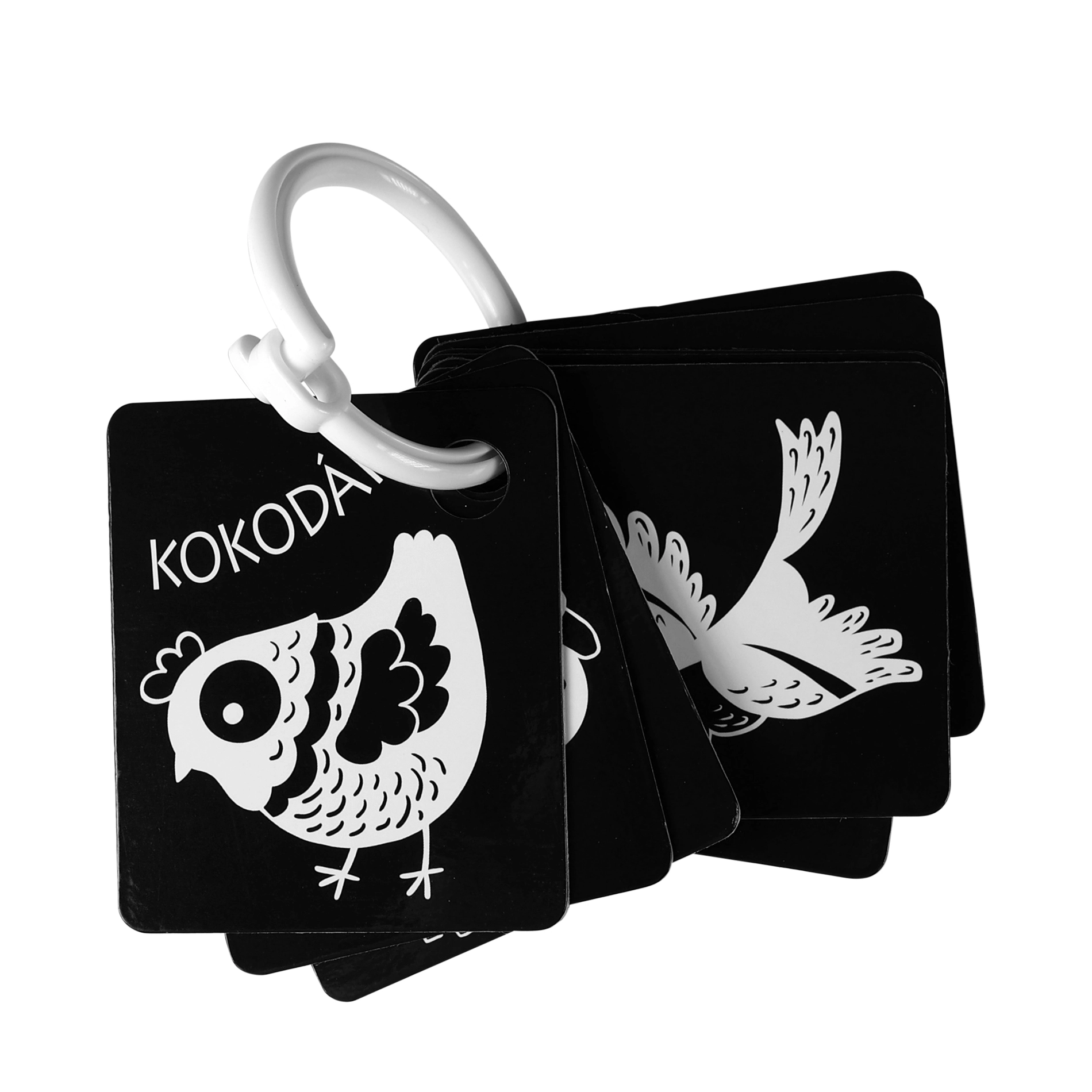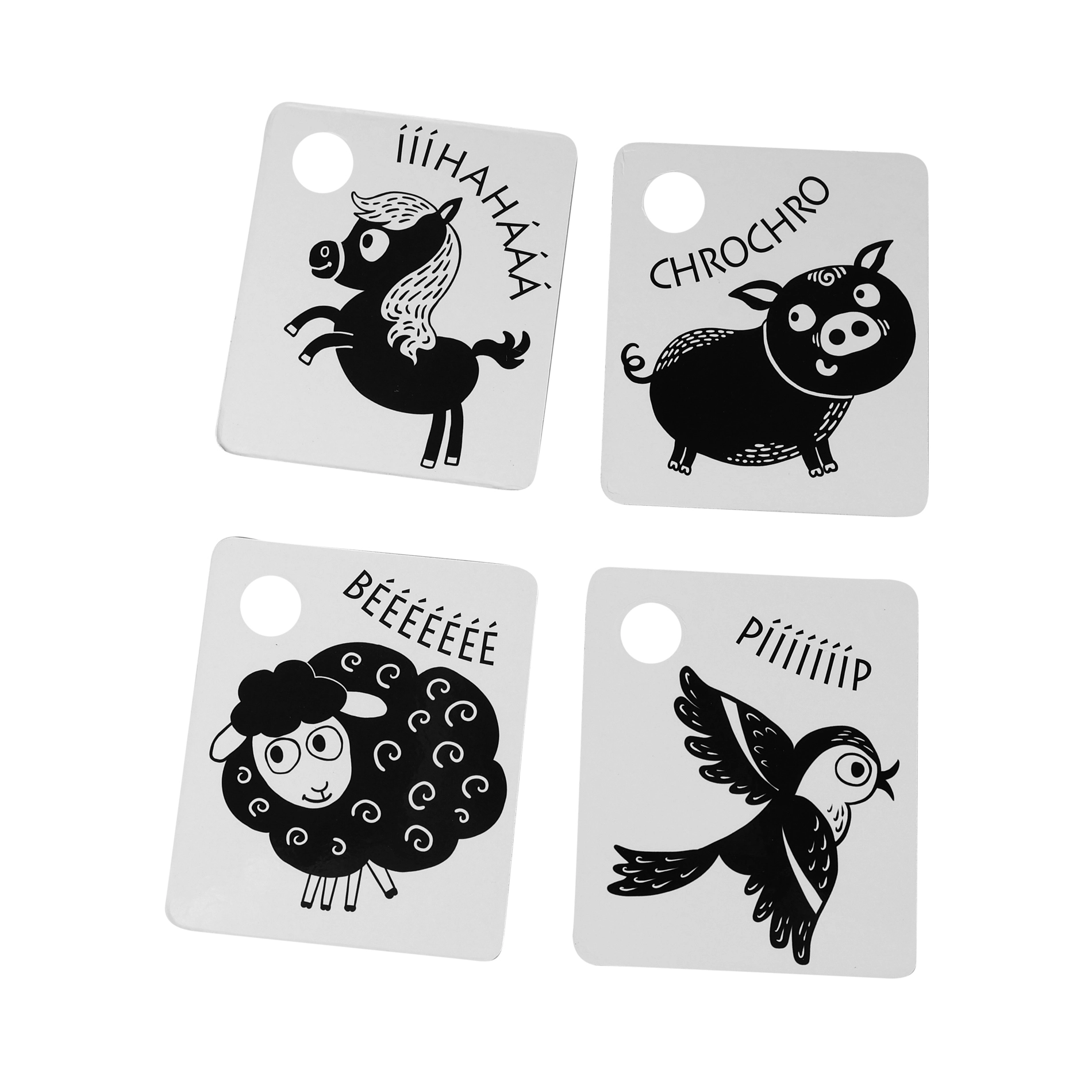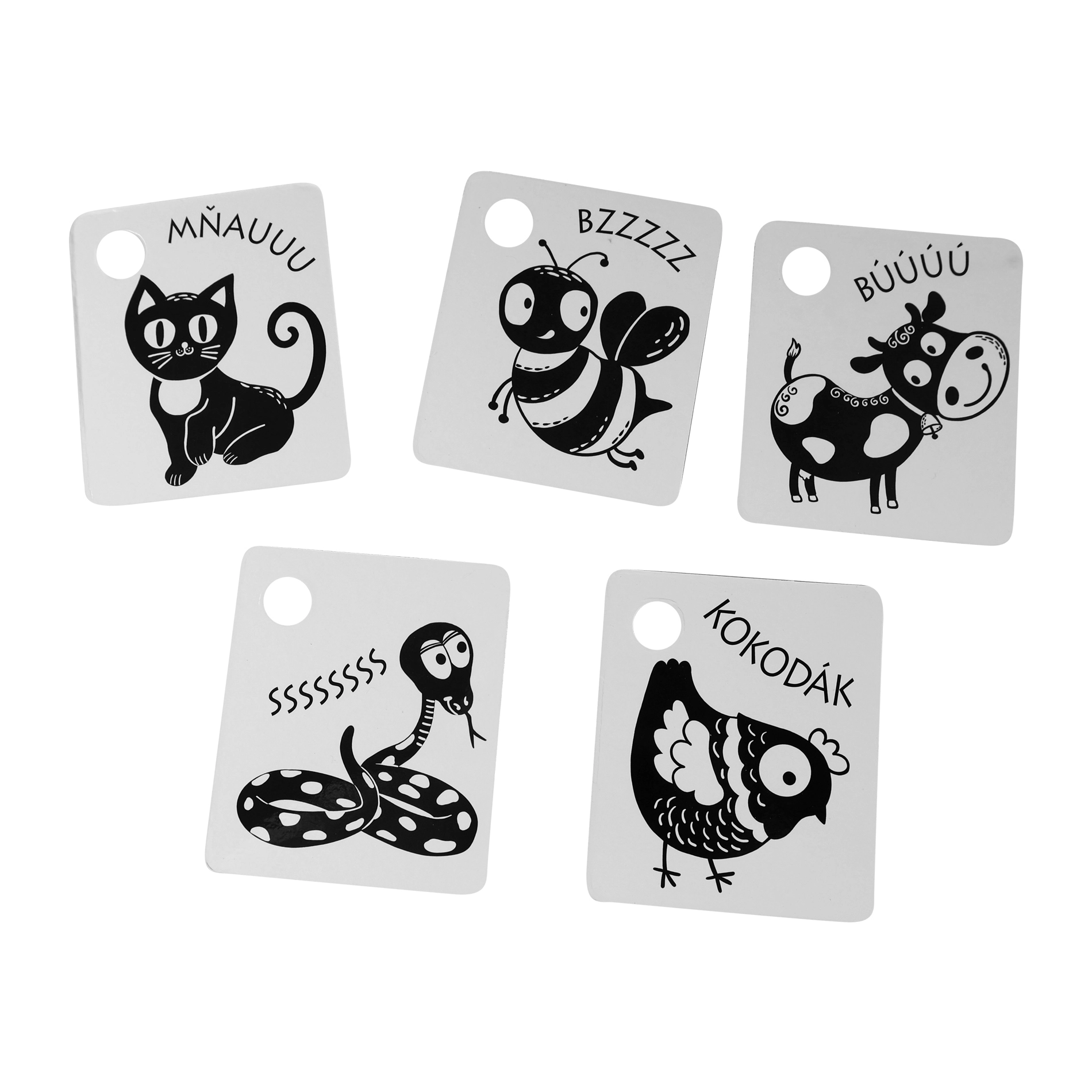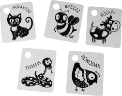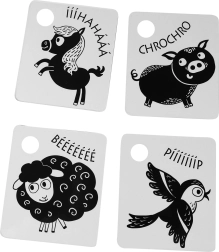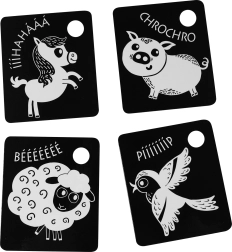 Palaikykite savo kūdikio raidą su kontrastinėmis juodai baltomis kortelėmis, kurios supakuotos po 9 vienetus iš kokybiškų čekiškų medžiagų. Kiekviena kortelė turi skylutę pakabinimui, o rinkinyje yra plastikinis žiedas patogiam sujungimui. Kortelės stimuliuoja regėjimą, lavina smulkiąją motoriką ir natūralų vaikų smalsumą, įskaitant gyvūnėlių pažinimą.