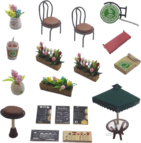 Nuo kavos aparato ir vitrinų su kepiniais iki padėklų, gėrimų ir dekoracijų – kiekviena detalė sustiprina jūsų modelio tikroviškumą.
