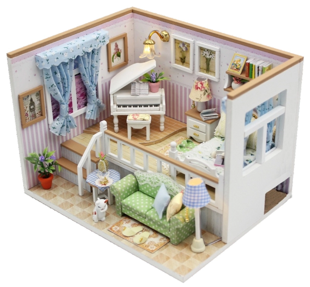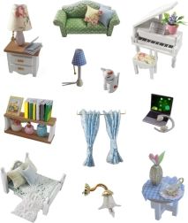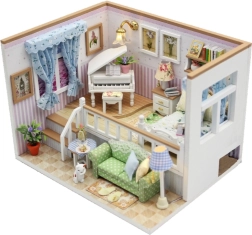 Sukurkite savo miniatiūrinį interjerą, kupiną realistiškų detalių – patogią sofą su pagalvėlėmis, elegantišką pianiną, lovą su tekstiline patalyne, šviestuvus, lentynėles ir subtilias dekoracijas. Integruotas LED apšvietimas suteikia scenai jaukumo ir paverčia jūsų kūrinį išskirtine dekoracija lentynoje ar darbo stalo kampe.
