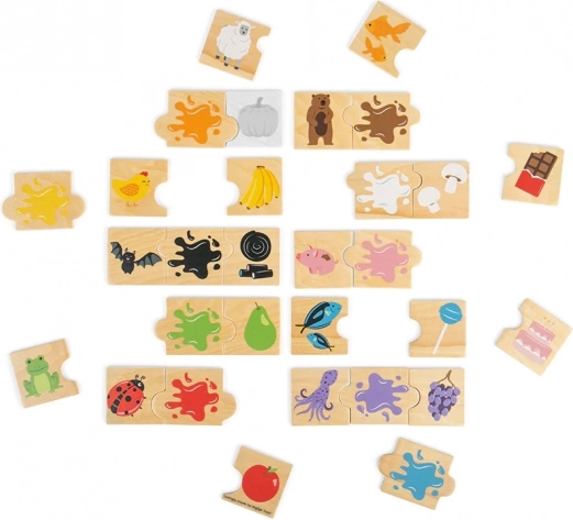 Smagi medinė didaktinė dėlionė iš Bigjigs Toys moko vaikus atpažinti spalvas naudojant 30 detalių 10 spalvų. Jungiamos trijulės (gyvūnas, daiktas, spalva) lavina akių–rankų koordinaciją, loginį mąstymą ir plečia žodyną. Tinka vaikams nuo 2 metų.