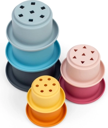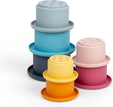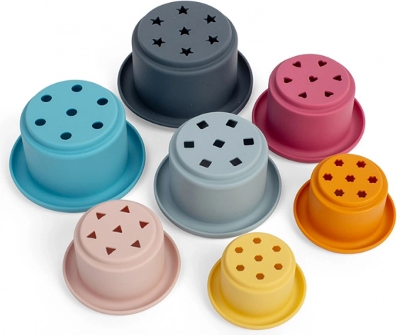 Be plastiko, 100% silikonas yra malonus vaikų rankoms, kartu labai atsparus temperatūroms ir dėmėms. Priežiūra paprasta – pakanka šilto vandens ir švelnaus muilo arba indaplovės. Žaidimas su puodeliais lavina motorinius įgūdžius, sensoriką, pusiausvyrą ir ankstyvąjį loginį mąstymą.