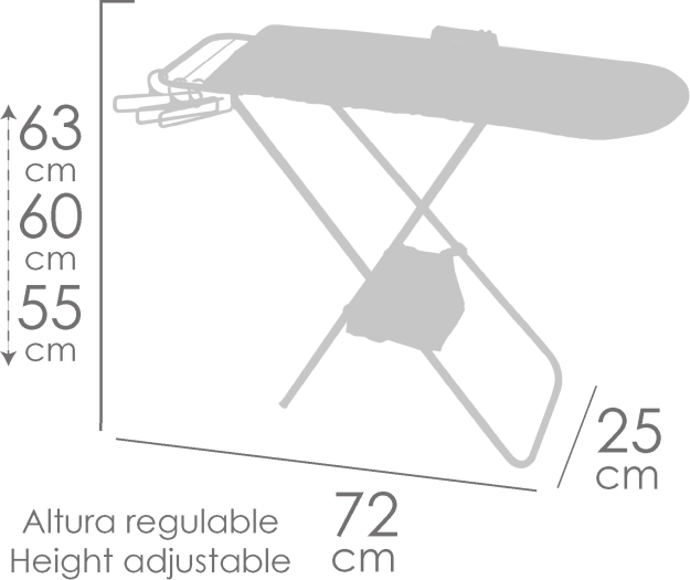 Rinkinyje yra praktiški priedai pilnaverčiam žaidimui – plastikinė lygintuvė, 3 pakabėklai suknelėms ir austinio audinio krepšelis, pritvirtintas prie konstrukcijos. Lenta yra sulankstoma, ją lengva nešioti ir laikyti, o dėl kokybiškų medžiagų (metalas, plastikas, tekstilė) ji atlaiko kasdienį naudojimą.
