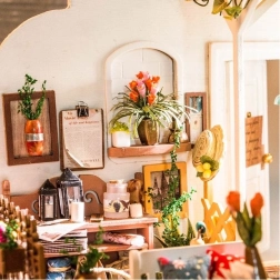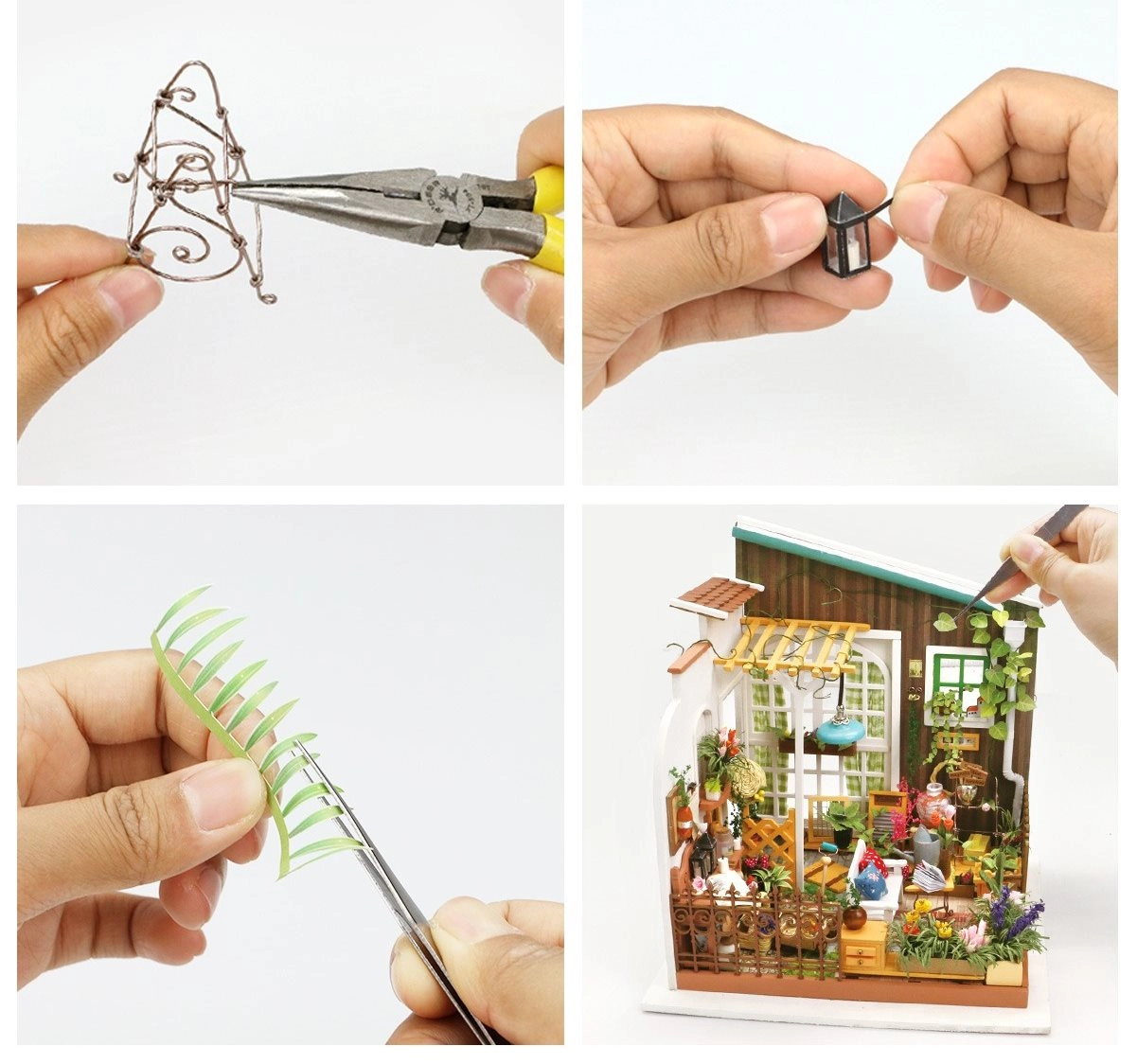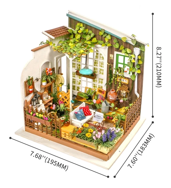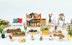Miniatiūrinės gėlės, baldai, pagalvėlės ir aksesuarai kuria tikrovišką sodo terasos atmosferą – idealiai tinka kaip stilinga namų dekoracija.