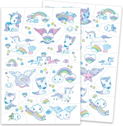 Pažadinkite vaikų vaizduotę su magiškomis DJECO tatuiruotėmis. Rinkinyje rasite 2 lapus, 21 × 14 cm, pilnus vienaragių, vaivorykščių ir debesėlių. Lengva ir greita aplikacija su vandeniu, tatuiruotės dermatologiškai patikrintos ir tinka vaikams nuo 3 metų.