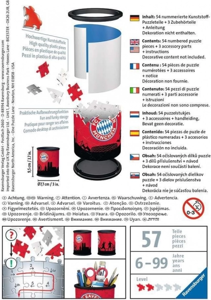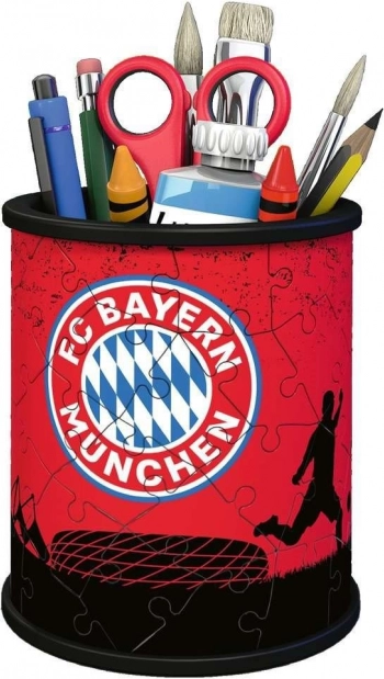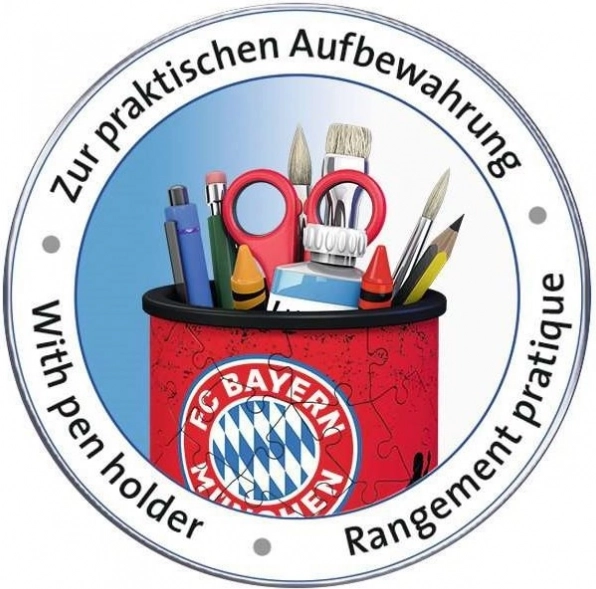 Tvarkykite savo rašomąjį stalą stilingai! Ši pieštukinė, sukurta kaip RAVENSBURGER 3D dėlionė su FC Bayern Miunchenas motyvu, turi 57 tvirtas plastikines detales, kurios tiksliai susijungia be klijų. Baigtas stovelis yra stabilus, praktiškas ir tinka ne tik rašymo reikmenims, bet ir kosmetikai bei smulkmenoms.