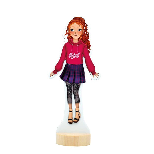 Ši magnetinė lėlė pradžiugins mažus mados ir kūrybos mylėtojus. Dėl 30 magnetinių dalių galima lengvai derinti skirtingus aprangos komplektus, keisti batus ir aksesuarus bei kaskart sugalvoti naują stilių. Stabilus medinis stovelis išlaiko lėlę žaidimo metu ir palengvina sukurtų derinių eksponavimą.