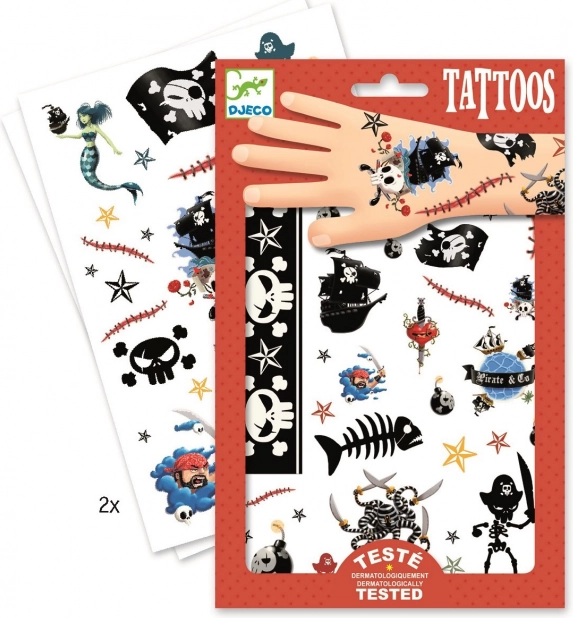 Leiskitės į nuotykius atviruose vandenyse su laikinosiomis DJECO tatuiruotėmis piratų tematika. Subtilios iliustracijos, sodrios spalvos ir smagūs motyvai pradžiugins tiek vaikus, tiek tėvus – ar tai būtų gimtadienio šventė, karnavalas, ar paskatinimas už pastangas.