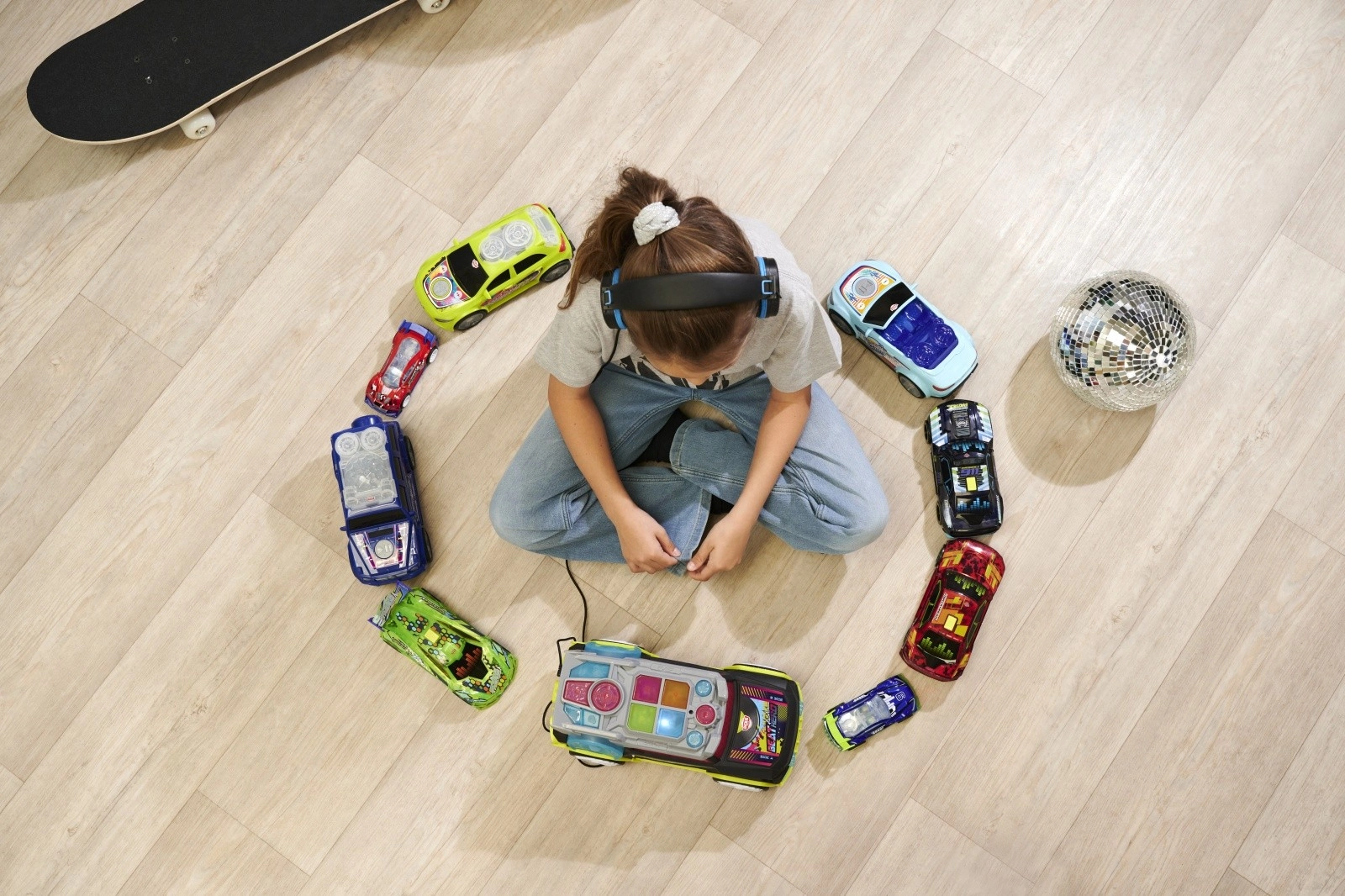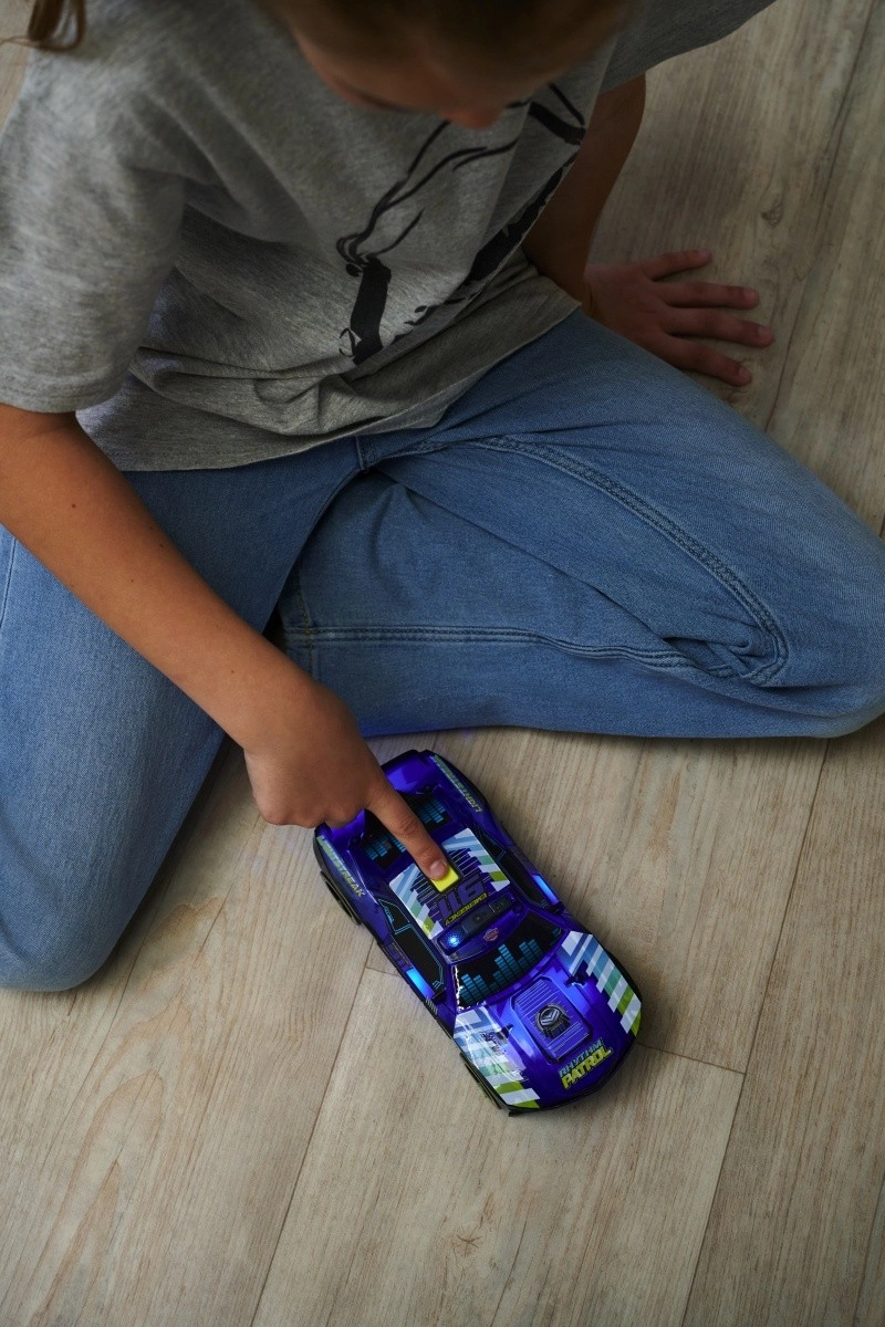 Tereikia automobilį patraukti per grindis ir paleisti – jis pajudės be baterijinio variklio, idealiai tinka greitam ir intuityviam žaidimui.
