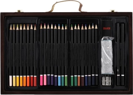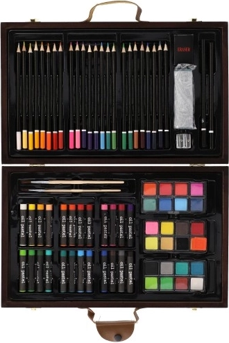 Sudėtyje yra pieštukai, vaškai, grafitiniai pieštukai, akvarelės, teptukai, drožtukas ir trintukas – iš viso 79 pagrindiniai meniniai reikmenys.