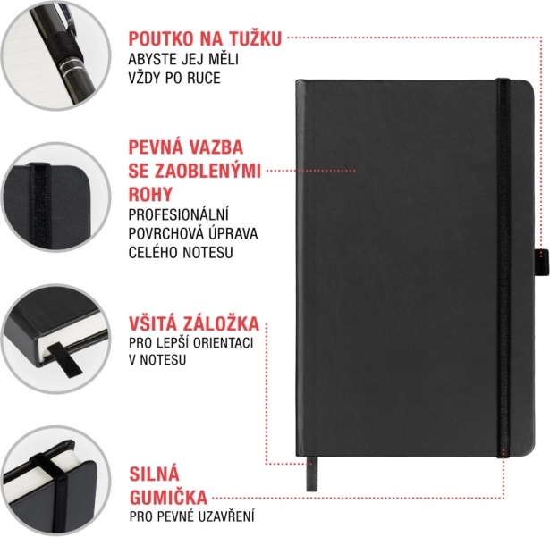 Linijiniai puslapiai, juostelinė skirtukinė ir vidinė kišenė smulkmenoms palengvina kasdienį darbą ir planavimą.