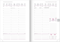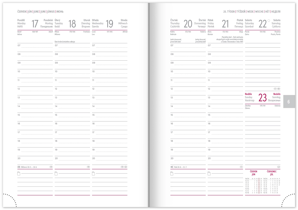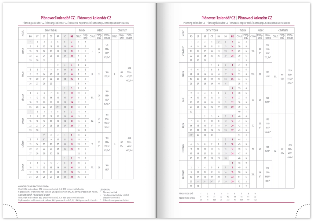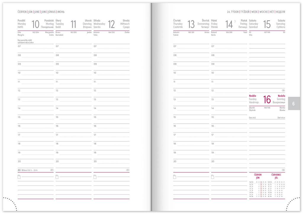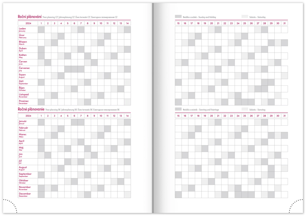 Savaitinis dienoraštis Capys 2024 elegantiškos raudonos spalvos, su struktūruotu drobiniu paviršiumi, idealiai tinkančiu folijinei spaudai. Jame yra savaitinis planas su čekų–slovakų kalendoriumi, papildytu anglų, vokiečių, vengrų ir rusų kalbomis.