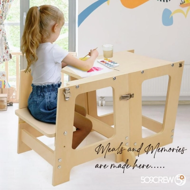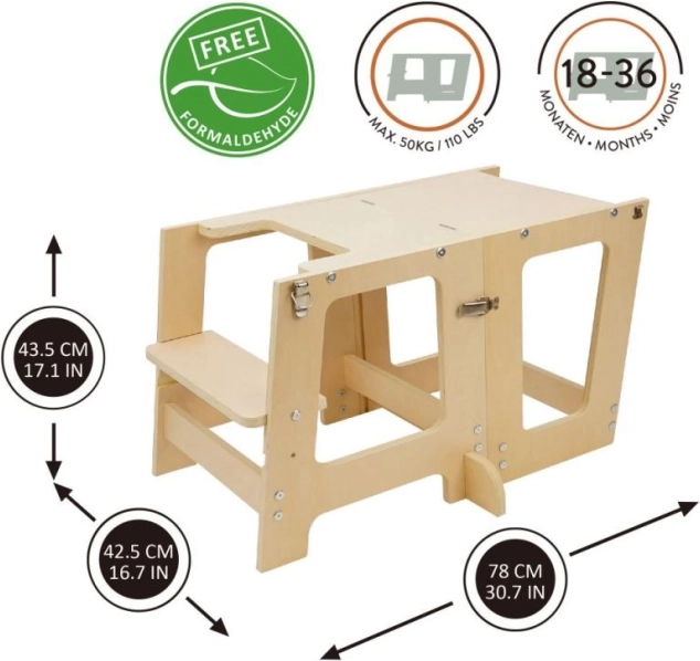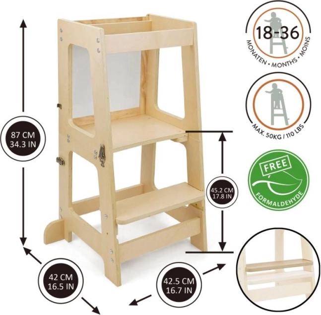 Prema 3 viename mokomasis bokštas pagamintas iš aukštos kokybės ir patvarios faneros, kuri užtikrina lengvą surinkimą ir ilgą tarnavimo laiką. Jis turi 2 aukščio lygius (16,5 cm ir 22,5 cm), kad lengvai prisitaikytų prie jūsų vaiko augimo.