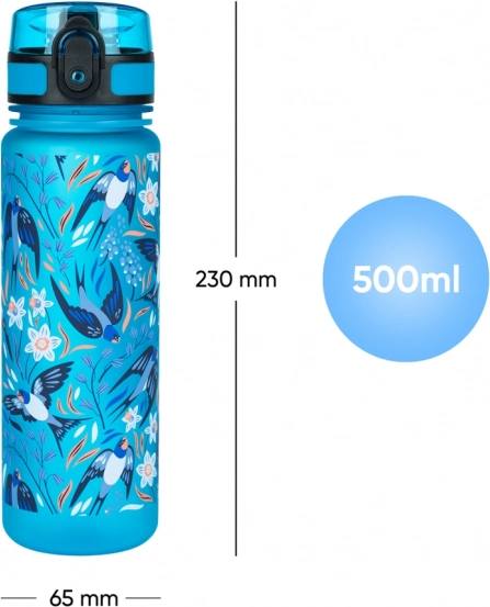Stilinga tritano BAAGL gertuvė su kregždučių motyvu, 500 ml talpos, idealiai tinka į mokyklą, išvykas ir sportui. Siūlo užrakinamą dangtelį nuo išsiliejimo, dirželį patogiam nešiojimui ir įdedamą sietelį vaisiams ar arbatai. Pagaminta iš saugaus, be BPA tritano, be kvapo ir tinkama net karštiems gėrimams.