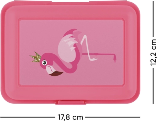 Dėžutė traukia akį žaismingu flamingo motyvu ant dangtelio. Rožinės spalvos ir linksmo piešinio derinys pagyvins kiekvienus pietus.