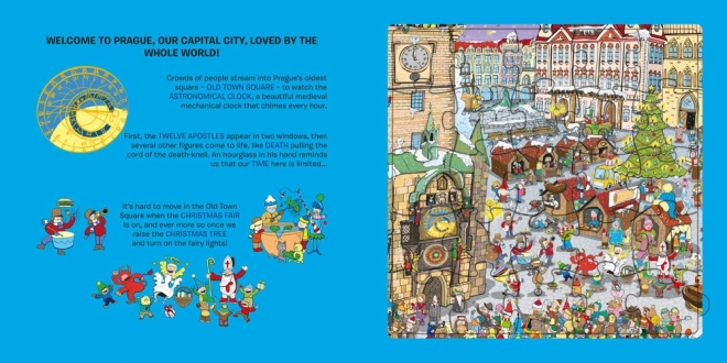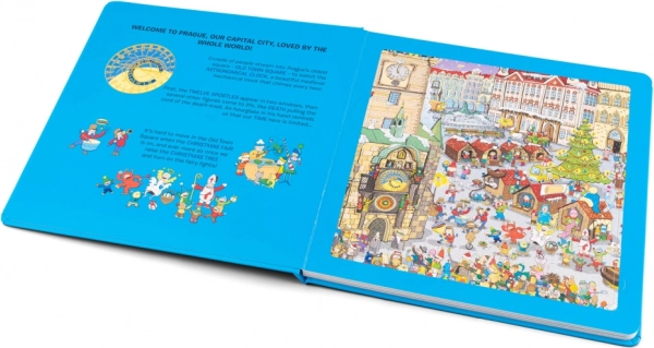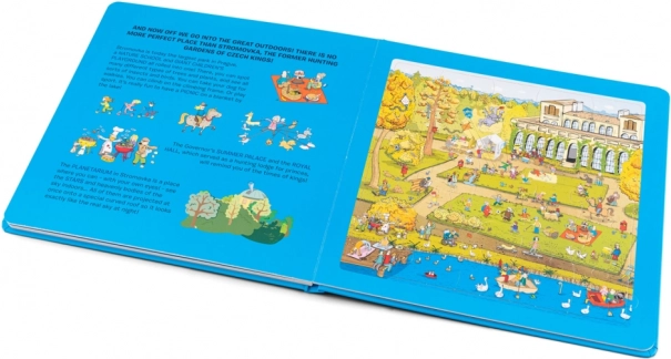 Praktinis pavyzdys, kaip jūsų vaikai gali žaismingai tyrinėti Prahą dėliodami dėliones kiekviename knygos puslapyje.